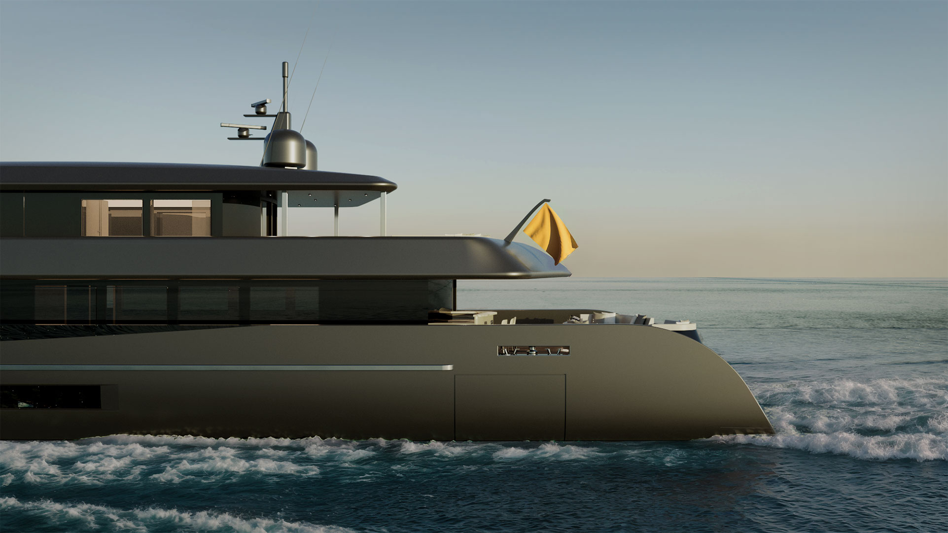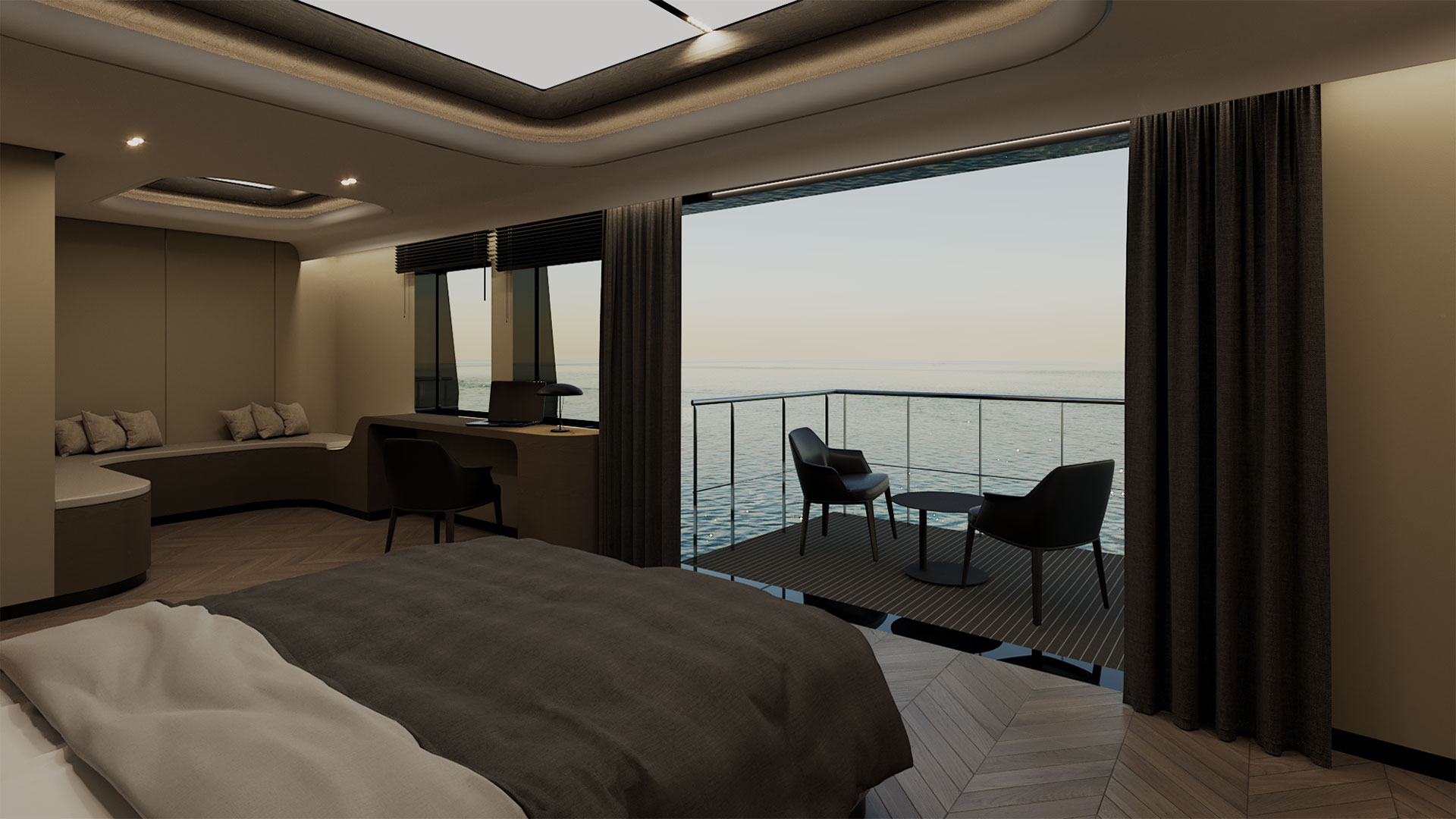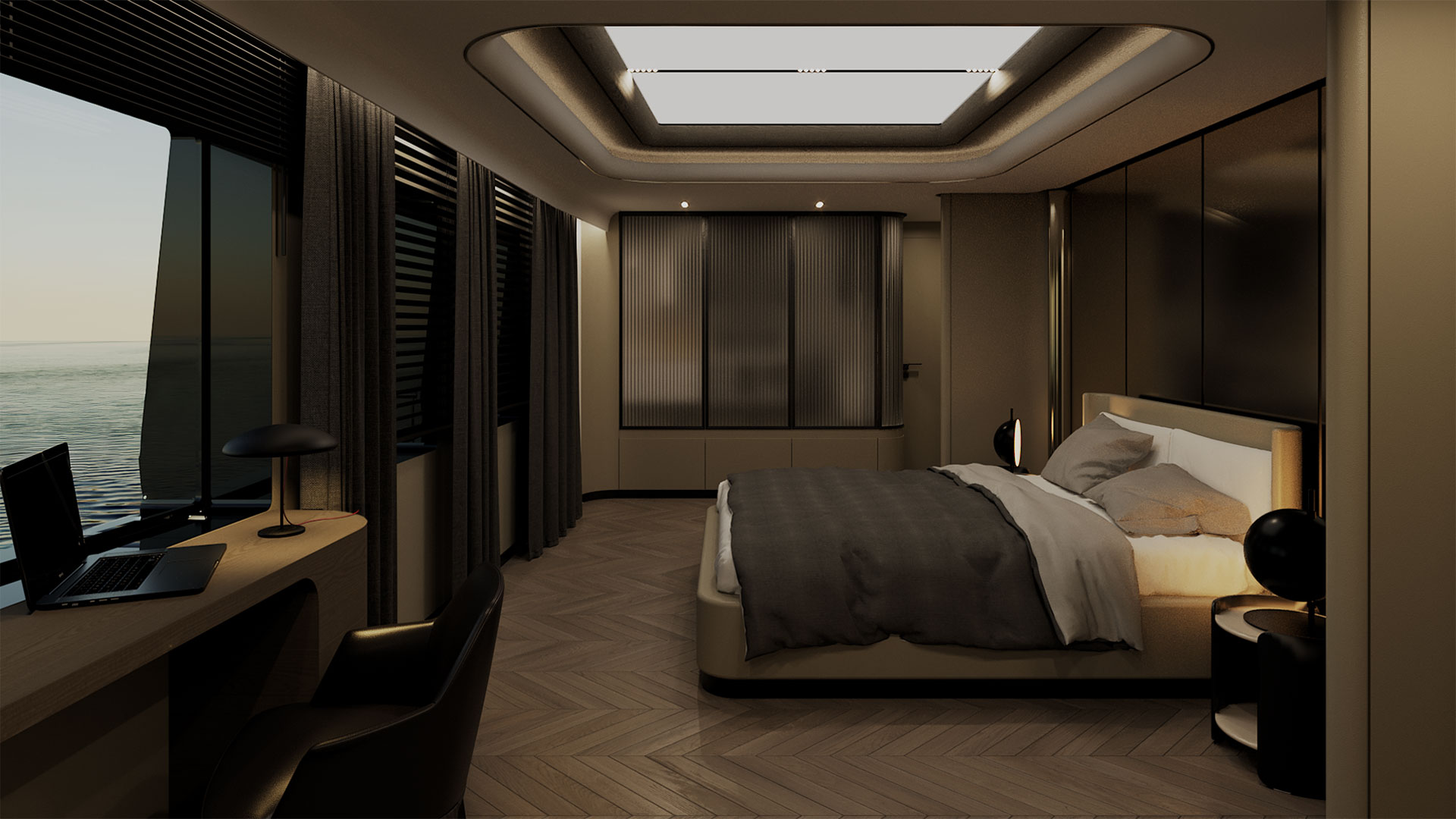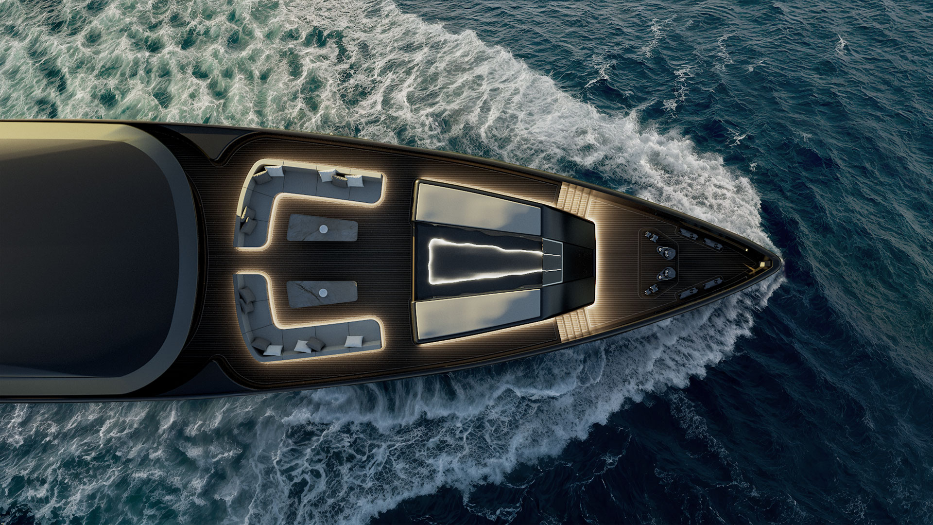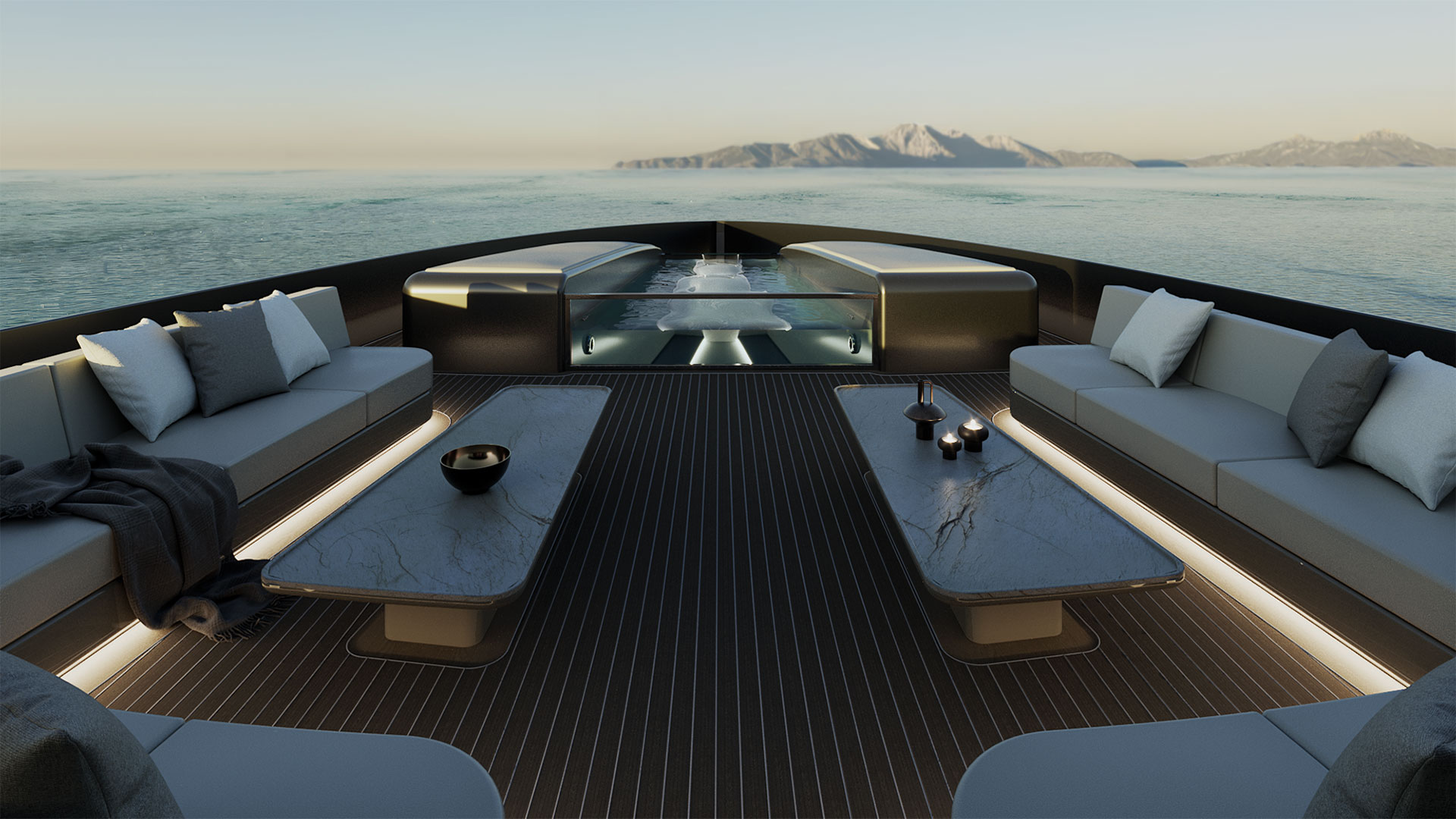 The wooden deck introduces warmth and tactile contrast, balancing the sleek surfaces while reinforcing the yacht’s dialogue with its marine environment. Together, materiality, proportion, and form create a harmonious composition where architecture and landscape merge, resulting in a refined vessel that embodies luxury through simplicity, fluidity, and spatial continuity.