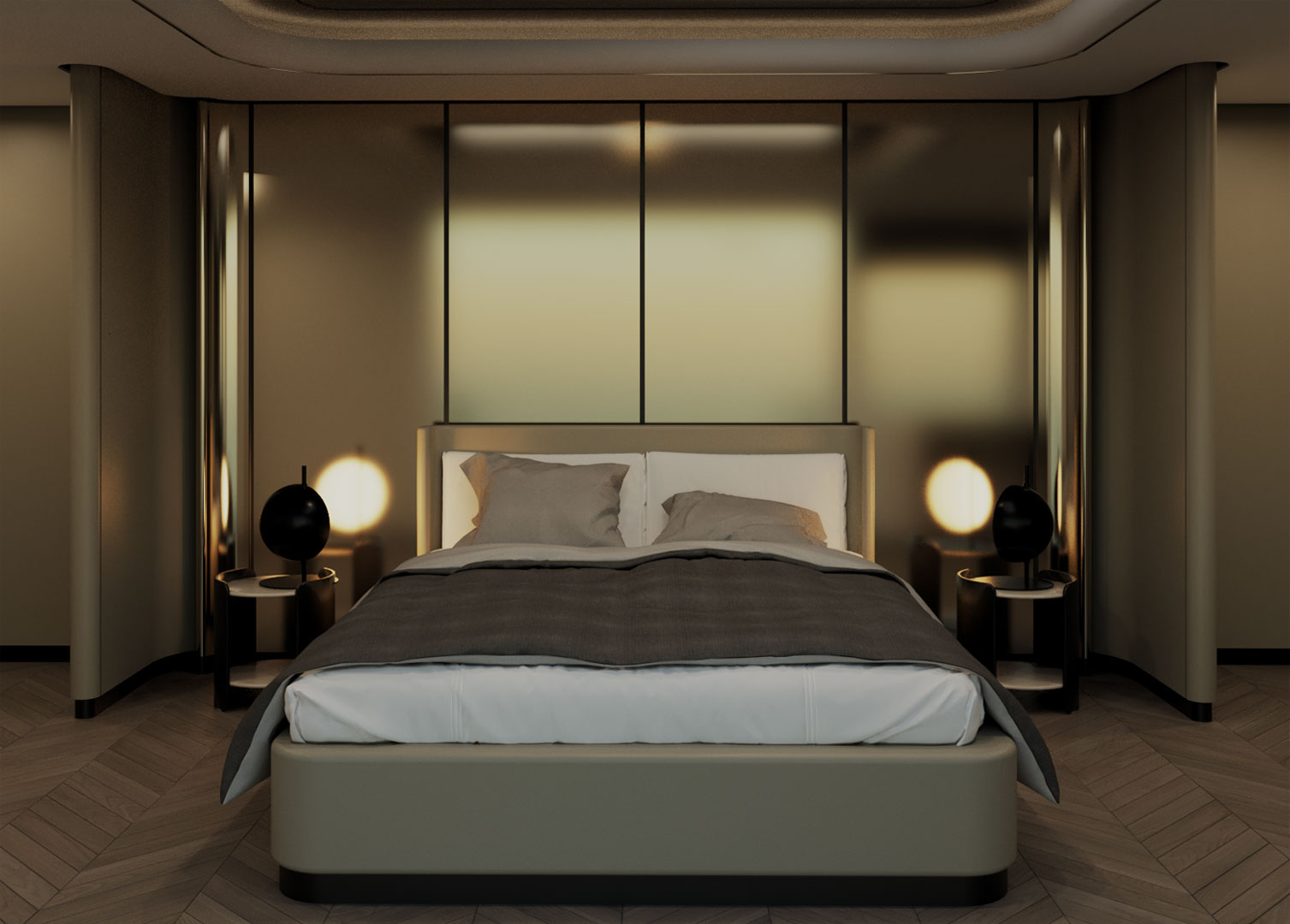 A key design principle is the seamless connection between interior and exterior spaces. Extensive glazed openings frame panoramic views of the sea, allowing natural light to flood the interiors and enhancing the sense of openness throughout the yacht. The use of high-gloss materials plays a central role in the spatial experience, subtly reflecting the surrounding water and visually extending the sea into the interior spaces.